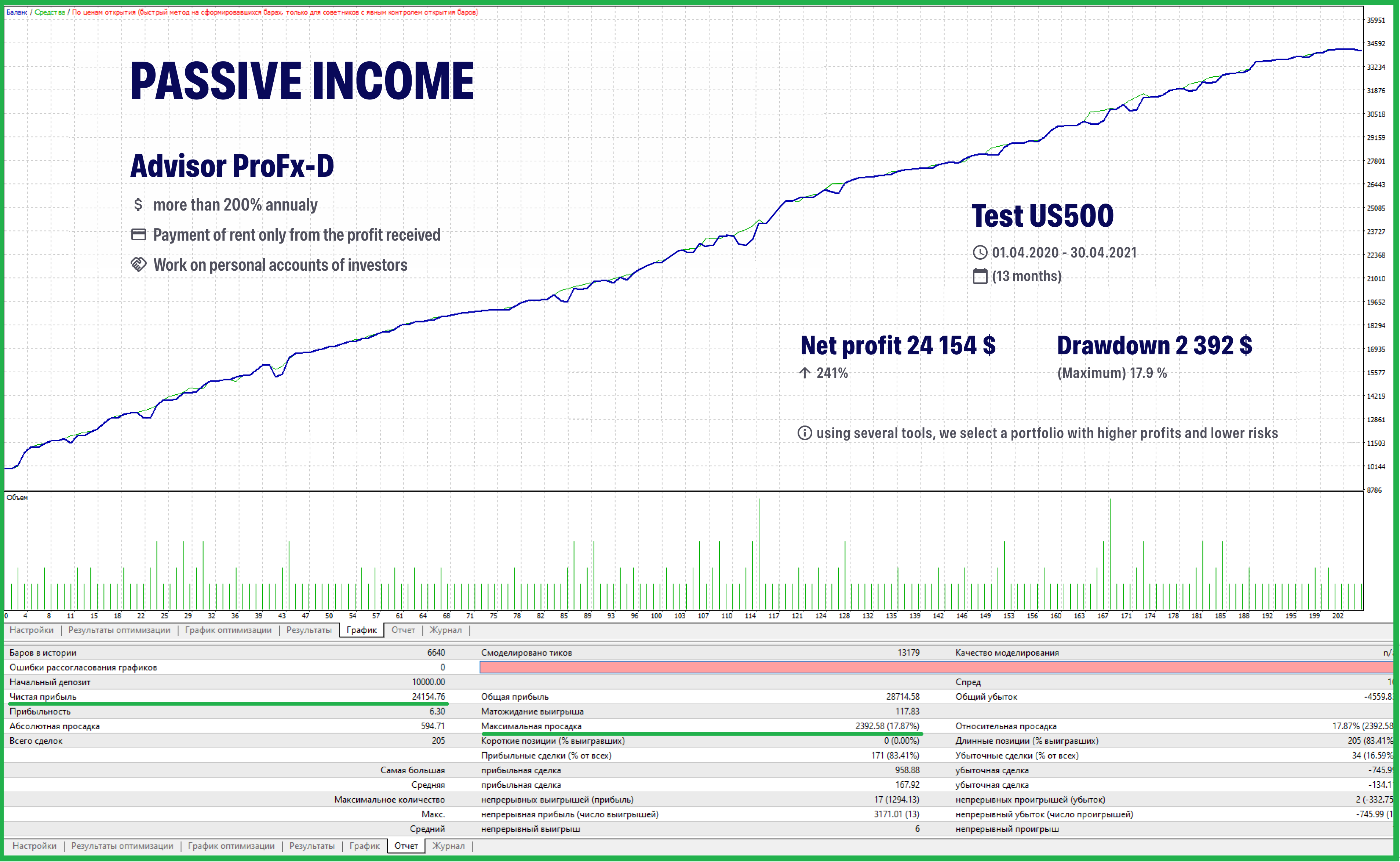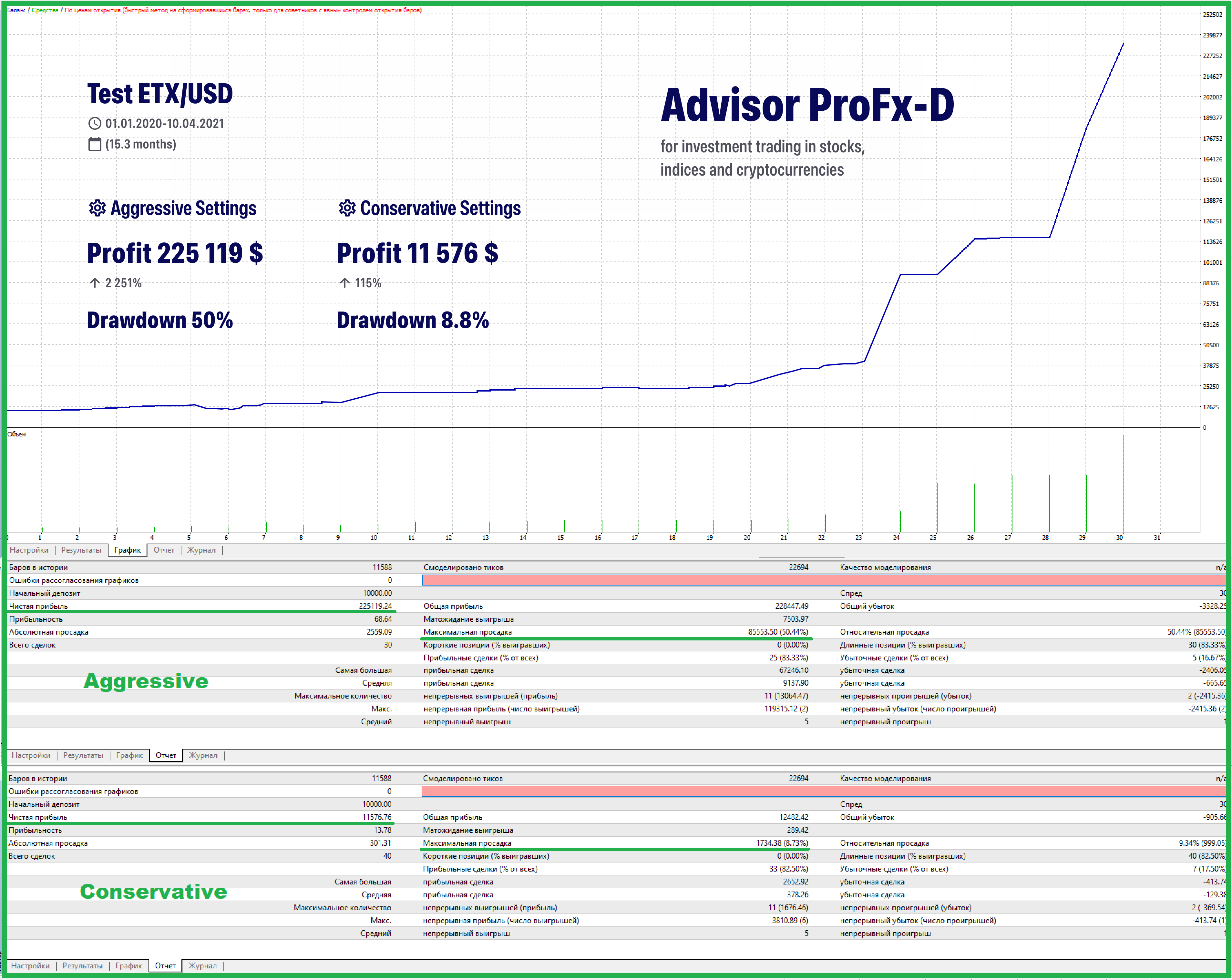 The ProFX-D Expert is designed for investment trading of stocks, indices and cryptocurrencies.